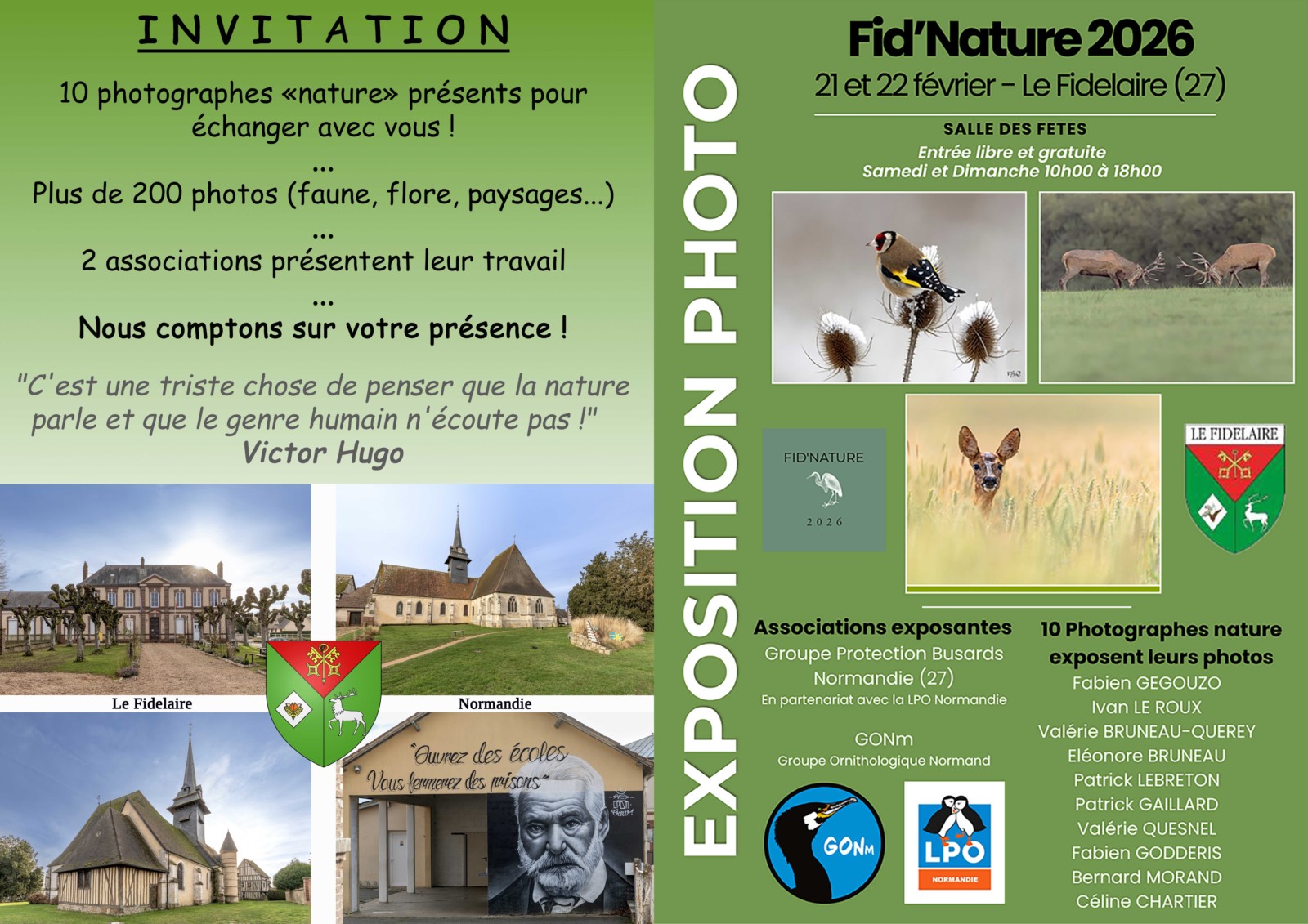L'exposition Fid'Nature regroupera dix photographes animaliers qui présenteront leurs œuvres (avec plus de 200 photos !) et deux associations « Nature » viendront pour partager leur travail et quelques photos avec le plus grand nombre : le GONm (Groupe Ornithologique Normand) et le Groupe Protection Busards Normandie qui collabore avec la LPO Normandie (Ligue de Protection des Oiseaux).